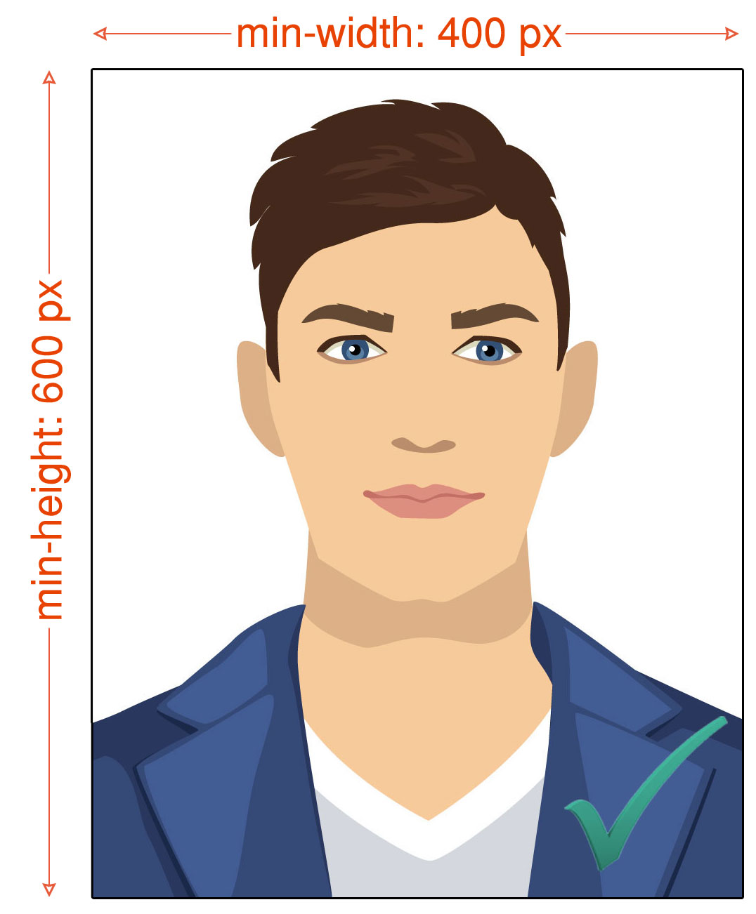 Your photo must be in JPEG format, with a minimum resolution of 400 x 600 pixels. It should be taken against a white background, with your face clearly visible and occupying a significant portion of the image, as illustrated in the sample below.